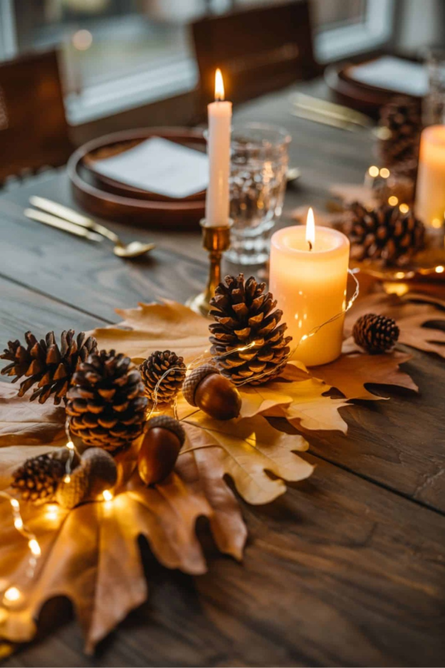 For a woodsy table theme and muted colors, focus on collecting treasures from the areas around your garden or the forest floor. Oak leaves pressed flat from the runner base. A variety of pinecones in different sizes add interest, and acorns help fill in the gaps. Simple pillar candles and a thin strand of twinkle lights add some shimmer. Tea lights could replace the twinkle lights if you wanted to strictly use candles. See more detailed instructions over at Abloom Decor.