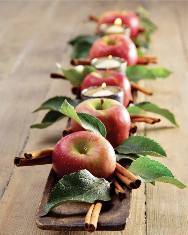If you have a narrow wooden tray, make a simple arrangement of apples, fresh green leaves, and bundles of cinnamon sticks. For the freshest leaves, wait until the morning that you’re hosting to pick them off a tree and bring them inside. If you don’t have a wooden tray, you could even spread out a pretty scarf or fabric scrap with fall colors.